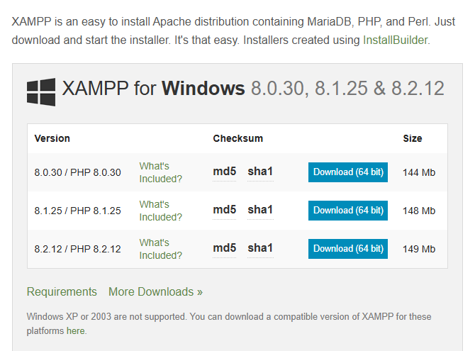 Comes with Apache, PHP, and MySQL in one package. After installation, open the XAMPP Control Panel and start Apache + MySQL. Download from official website apachefriend.org